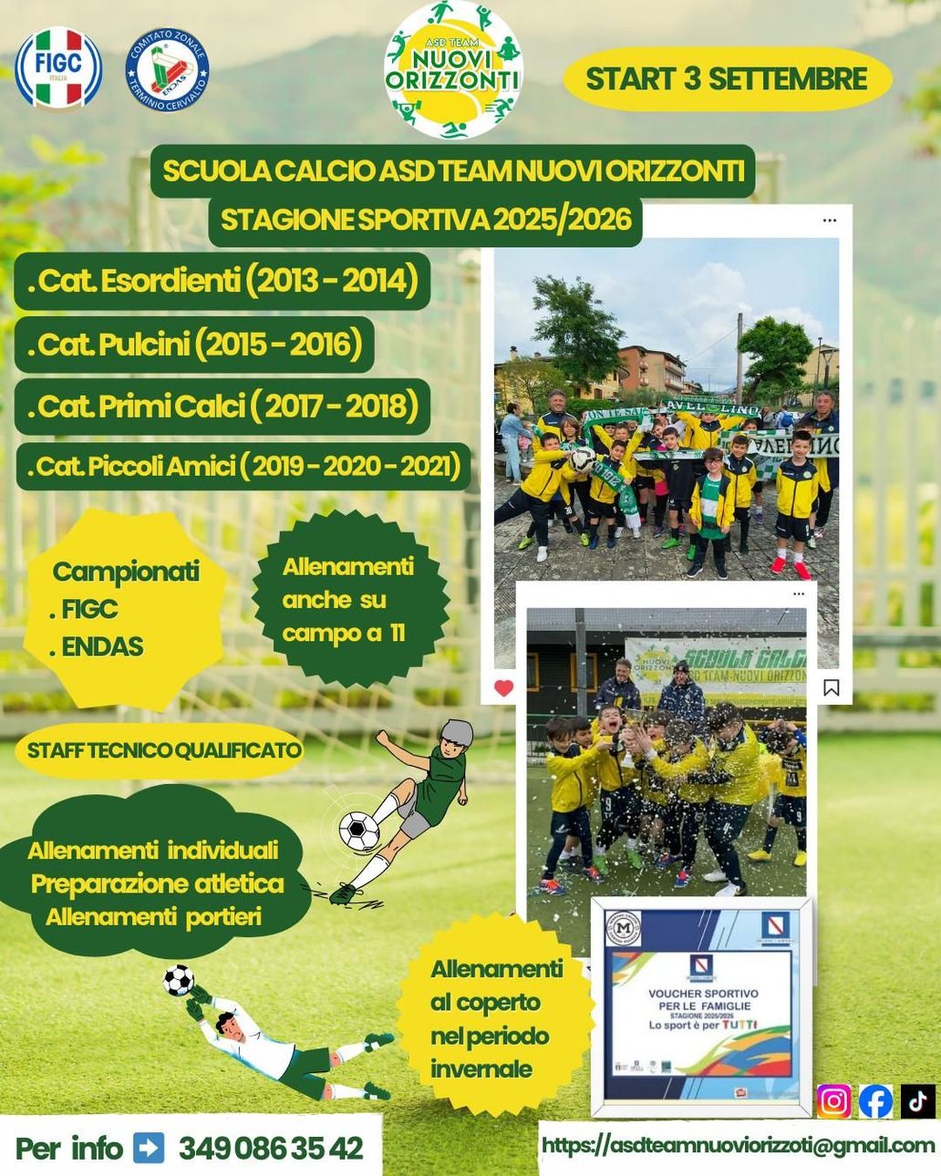 La scuola calcio ASD TEAM NUOVI ORIZZONTI è pensata per bambini e ragazzi di tutte le età, con l’obiettivo di insegnare le basi del calcio e farli crescere nel rispetto della disciplina. L'organigramma della scuola calcio è composto da allenatori qualificati FIGC che guidano i giovani atleti con competenza, passione, in un clima di assoluta serenità dove l'obiettivo principale e di crescere e migliorare costantemente. Partecipiamo con tutte le categorie sia ai campionati FIGC che a quelli degli enti di promozione sportiva.